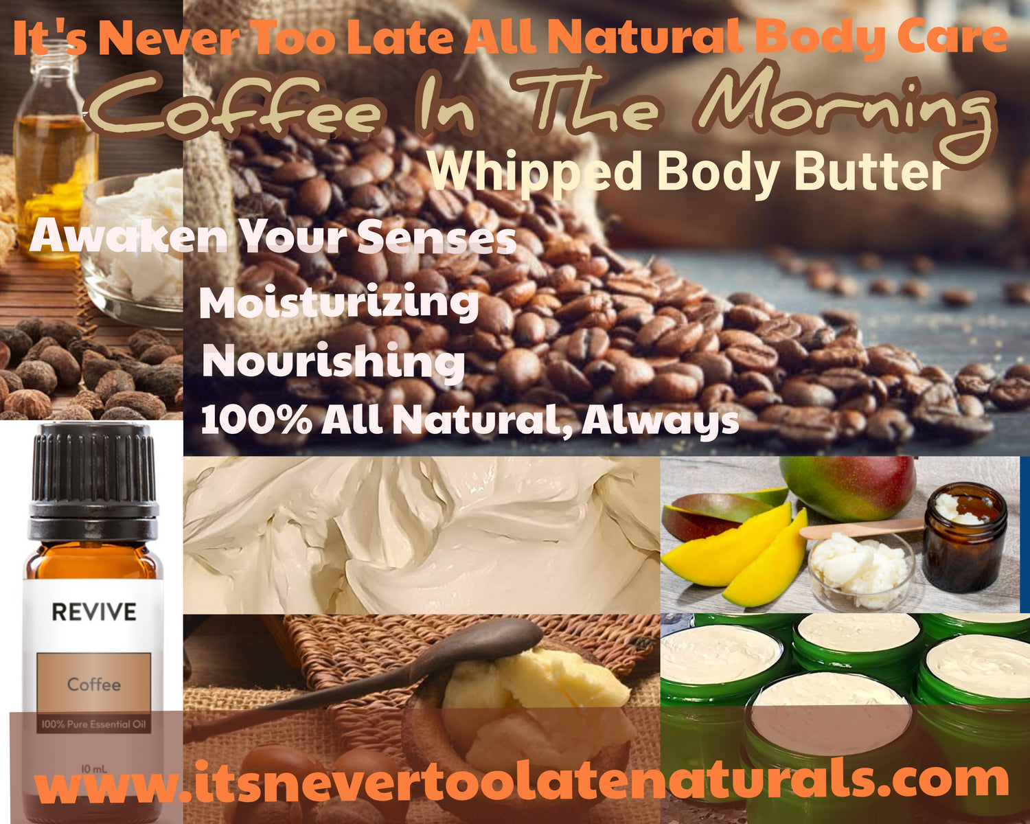 Thank you for stopping by! I hope you will enjoy our products just as much as I and my family do! Here at It's Never Too Late All Natural Body Care, my desire is to provide natural, plant based, non-synthetic body products that will nourish, moisturize, and rejuvenate your skin and your senses! All our ingredients are selected very carefully to ensure the best and healthiest product experience. Every product blend contains all 100% natural ingredients and is infused with pure, quality essential oils that maximize wellness benefits, including an enjoyable aromatic experience! No synthetic fragrances or preservatives. No artificial anything. We also use quality, tinted glass containers to better preserve ingredient integrity. You can even clean and reuse them. Thank you for the opportunity to help you treat your body & mind with some extra loving care!